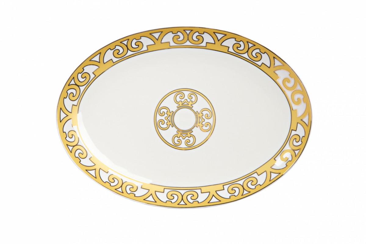 Классическое овальное блюдо из серии «Marbella» предназначено для подачи разнообразных нарезок и салатов, гарниров и вторых блюд. Изделие изготовлено из элитного костяного фарфора и украшено солярным символом и оригинальным орнаментом в стиле модерн moderne. Сочетание белоснежного фарфора и золотой отделки смотрится благородно и выразительно, делая коллекцию «Marbella» идеальным решением для праздничной сервировки стола.