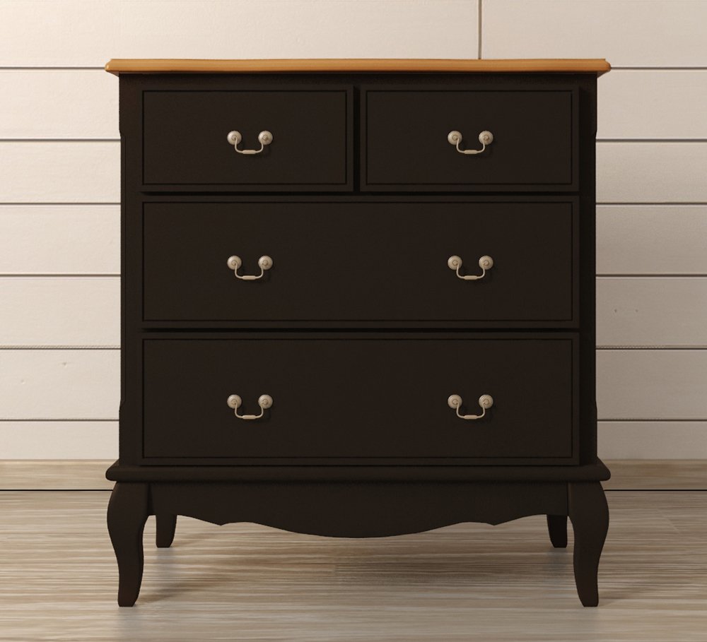 Цвет: Черный,Глубина, см: 42,Высота, см: 83,Ширина, см: 76,Материал: Массив березы,Массив ясеня,Вес: 45 кг,Размер: Маленькие,Стиль: Прованс,Особенности: Столешница - ясень,Форма: Прямоугольные,Цвет столешницы: Орех,Дизайн: Франция,Вид: Высокие,Ориентация: Вертикальная,Назначение: Для белья,Количество ящиков: 4,Ножки: с гнутыми ножками,Опора: На ножках, Комод Leontina Black 4 ящика черный
