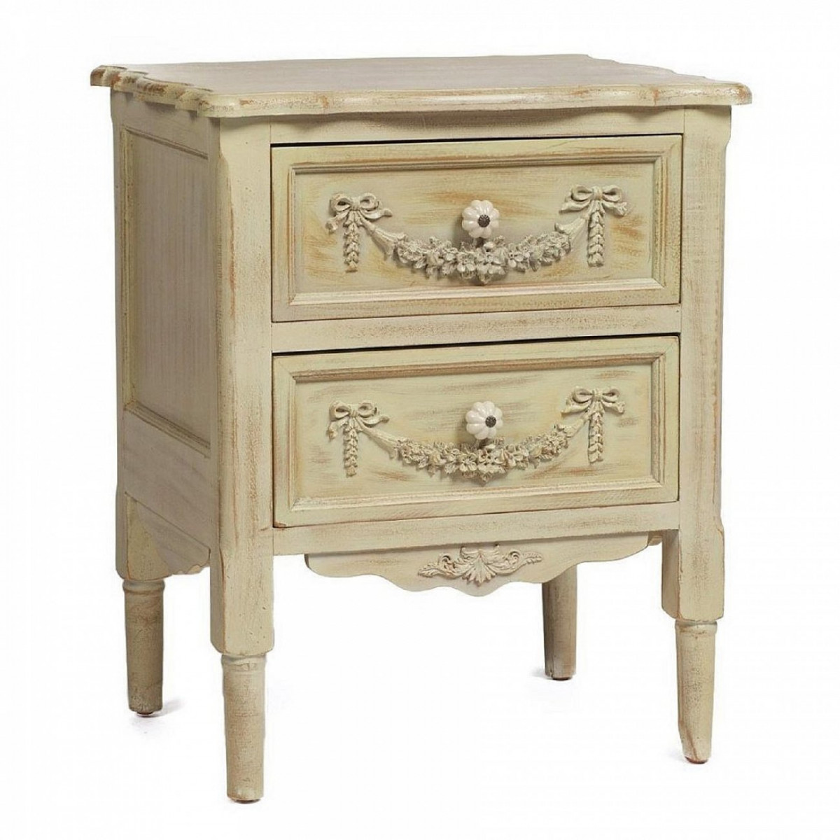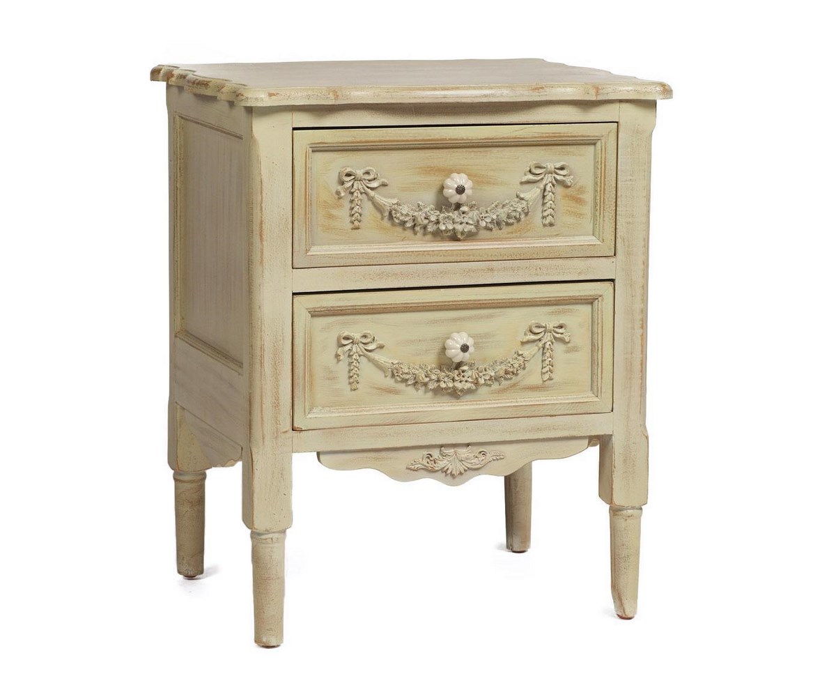 Эта тумбочка смотрится изящно, как благодаря элегантной форме, так и благодаря приятному кремовому цвету. Тумба сделана в модной состаренной манере, кажется, что это вещь из прошлой эпохи. Тумба выполнена из дерева ели, у нее есть два вместительных ящика, они украшены декоративной резьбой и фигурными ручками. Ножки тумбы также имеют необычную форму.