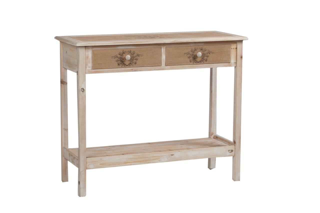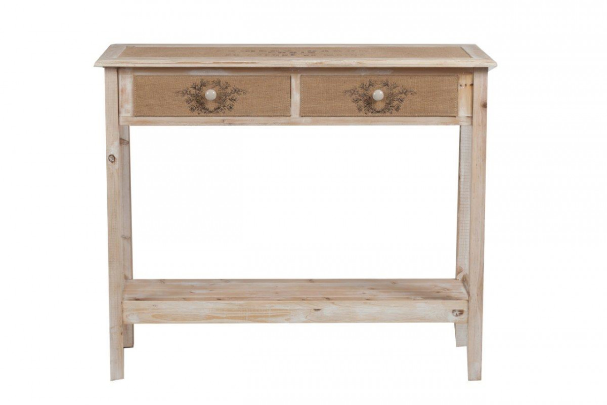 Хранить вещи можно и нужно красиво! Консоль Leticia — изысканный предмет интерьера, способный украсить собой любую комнату вашего дома, оформленную в стиле шебби-шик. Удобная столешница и два выдвижных ящика, декорированные джутовой тканью с рисунком, полка под ними позволяют удачно расположить необходимые под рукой аксессуары и важные бумаги. Консоль может выполнять функцию подставки под живые цветы и предметы декора.